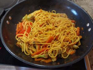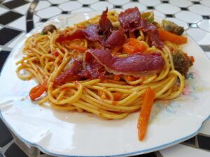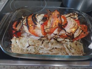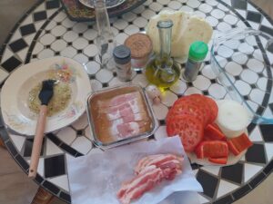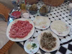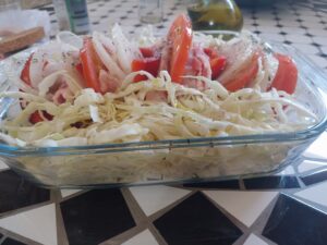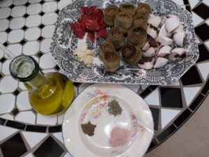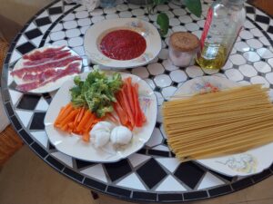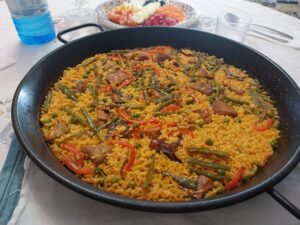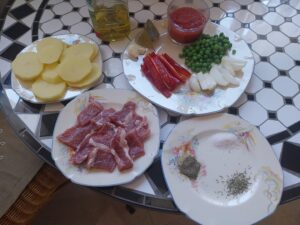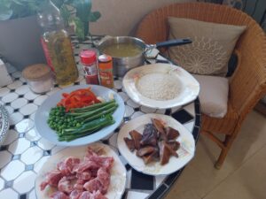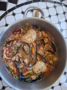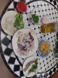 Ingredientes : 2 sepias medianas ,mejillones , almejas , gambitas , guisantes , cebolla , tomate , pimiento rojo , perjil , sal rosa , caldo de pescado y aceite de oliva .