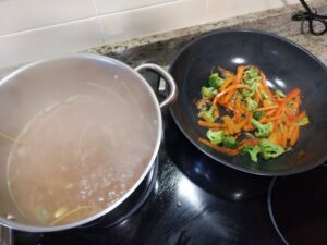 Pelamos las gambitas y la piel se las añadimos al caldo de los mejillones y almejas y ya tenemos el caldo preparado .