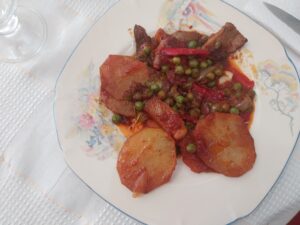 Cuando la cebolla empiece a dorarse añadimos los guisantes removemos un par de minutos y añadimos el tomate hasta que este sofrito ,