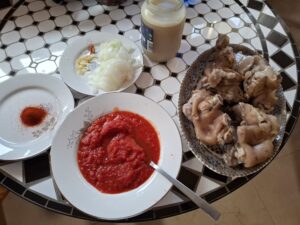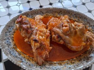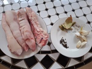 salpimentamos al gusto a continuacion le añadimos el pimenton rojo dulce y removemos y esta listo para añadir el tomate lo sofreimos y cuando veamos que esta hecho le añadimos el caldo de las patas de cerdo que teniamos reservado y las patas y dejamos cocer durante 15 minutos y ya tenemos listo unas tatas de cerdo sabrosisimas .