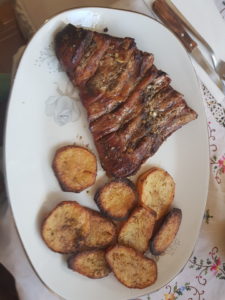 Patatas asadas : Pelar las patatas y cortarlas en rebanadas , yo en la bandejas del horno pongo papel para asar , el la bandeja echo un corrito de aceite , sal , pimienta , romero y tomillo , y coloco las patatas y en la parte superior de las patatas lo mismo mas un poco de pimienta dulce molida 60 minutos en el horno , a la mitad de asar sacar la bandeja y darles la vuelta a todos las patatas , y listo .