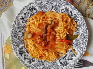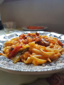 Sofrito : Aceite de oliva y cuando esta caliente se le echan los pimientos , la zanahoria y los ajos , como 5 minutos a continuación la cebolla y un poco de sal , cuando la cebolla esta pochada los champiñones y a continuación el tomate , se deja freí r a fuego lento hasta que veas que lo tienes echo y entonces le agregas la pasta le das unas vueltas y ya esta .