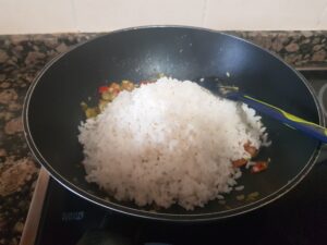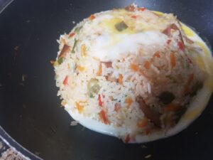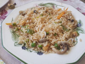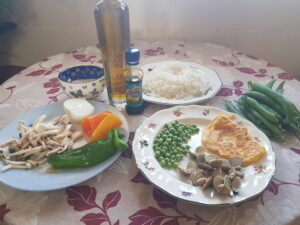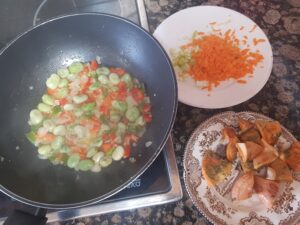 Cuando veamos que el sofrito esta medio echo añadimos los robellones cortados y los guisantes y dejamos terminar de sofreir todo .