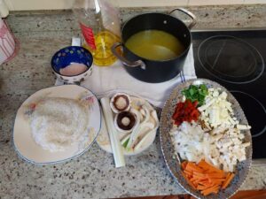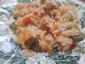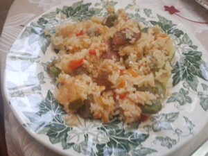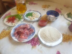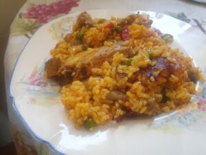 Ingredientes : Carne de cerdo ibérico ( presa o solomillo ) robellones ( setas ) dientes de ajo , guisantes , pimiento rojo y verde italiano , judias verdes finas y caldo de carne ( tres de caldo por una de arroz ) arroz , sal , perejil , aceite de oliva , pimentón rojo dulce triturado y cúrcuma .