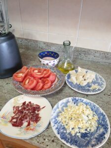 Ingredientes : Medio kilo de garbanzos cocidos , pimiento asado , tomate natural triturado , una lata de bonito en aceite de oliva , 2 pepinillos agridulces , aceitunas al gusto , las que te gusten a ti yo puse las chupadedos , 2 huevos cocidos , 3 patatas cocidas , pimiento verde picado ,lechuga , aceite de oliva , sal rosa y vinagre de manzana .