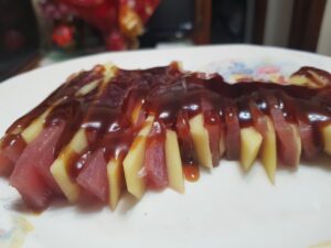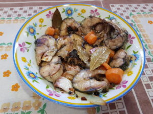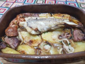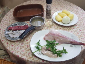 Ingredientes : Una patata pelada y cortada en rodajas de 2 cm , 6 mejillones cocidos frescos , 100 grmos de almejas pequeñas frescas , 2 calamares pequeños limpios y frescos , 3 rodajas de merluza fresca de unos 2 cm de grosor , una cebolla pequeña cortada a estilo juliana , un chorro de brandy , sal rosa al gusto , aceite de oliva , un tomate natural rallado , perejil , 5 dientes de ajos pelados , pimenton rojo dulce triturado y caldo de pescado ( yo use el caldo de los mejillones colado , el caldo de las patatas cocidas el despojo de la merluza y de los calamares bien limpio , sal al gusto y curcuma )