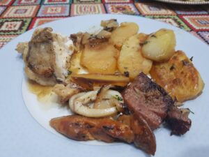 En una cazuela de barro coloco las rodajas de merluza los calamares los mejillones las rodajas de patatas el perejil las almejas crudas y sazono al gusto .