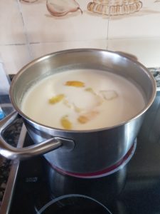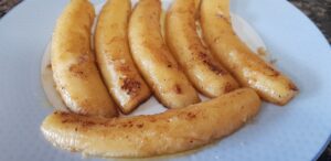 Preparación : Se cortan los plátanos por la mitad y se sofríen en mantequilla , cuando les damos la vuelta le añadimos un poco de azúcar morena y seguimos hasta que se doren , en ese momento le añadimos el brandy y flameamos y están listos para comer ,, buenísimos .