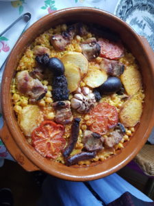 Se sofríen las patatas y se apartan , se sofríe la costilla con tomate y se aparta , se calienta el caldo de carne , y se tuesta un poco las hebras de azafrán , se incorpora en la cazuela de barro , el caldo , las patatas , las costillas , se le añade el azafrán un poco de sal las rebanadas de tomate crudo , se le incorpora los garbanzos que estén ya cocidos , las morcillas la chistorra y la cabeza de ajos todo al horno unos 30 minutos y ya esta ,,, importante una parte de arroz por dos de caldo o agua .